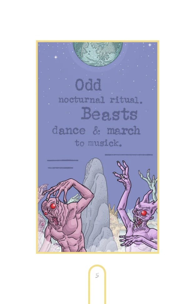 Hello awesome readers, it’s your old pal Skull with a book that I’m honestly, kind of in love with: H.P. Lovecraft’s Commonplace Book recently released by the rather awesome Lethe Press! Serious Lovecraft fans may be familiar with this little volume of his collected thoughts and ideas, but I’m willing to bet you haven’t seen it looking like this edition that is wonderfully illustrated by Michael Bukowski. I mean, when I opened the package and this purple-skinned beauty slid out, I immediately sat down and gave it my full attention. Check out the cover pic and the Odd nocturnal ritual. Beasts dance & march to musick image! The book is like this ALL the way through!
